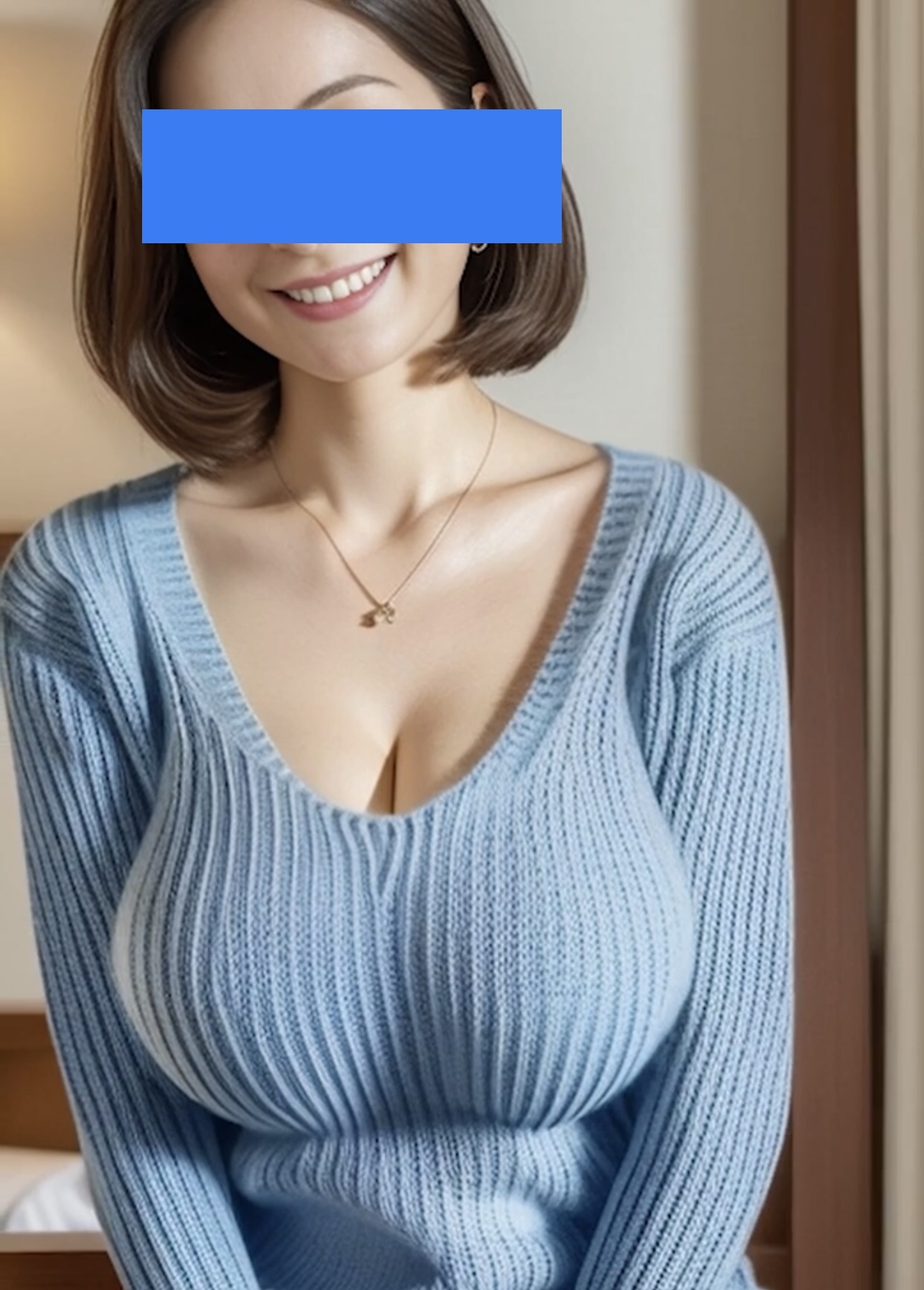 しのぶさんは薄手のニットを着ていて、その胸元は大きく開いて深い谷間がのぞいていた。