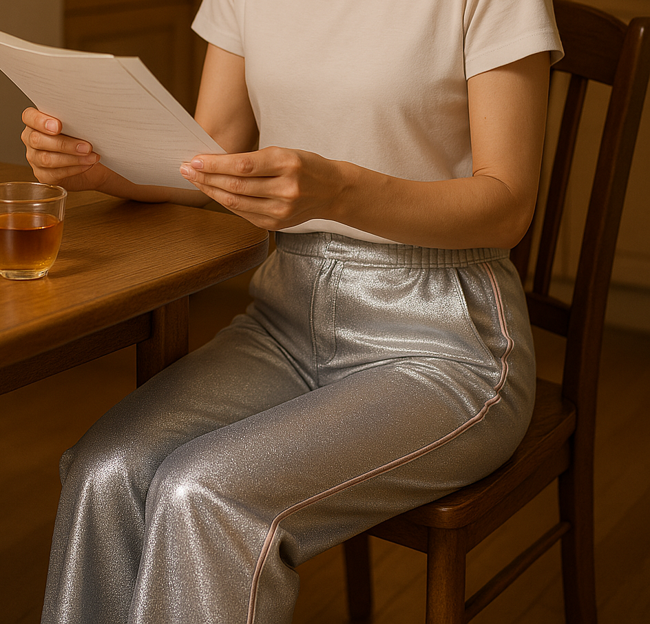 淡いシルバーの生地は、キッチンの照明を受けてやわらかく光沢を放っていた。